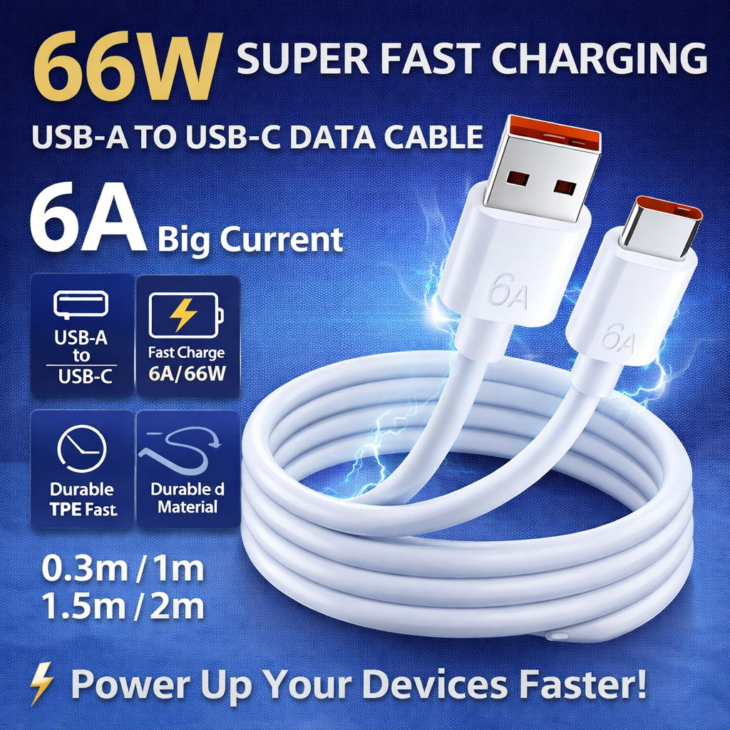 Experience ultra-fast charging with the 66W USB-A to USB-C Fast Charging Cable, designed for high-speed performance and durability. With support for 6A fast charging, this cable ensures your devices charge quickly and efficiently.