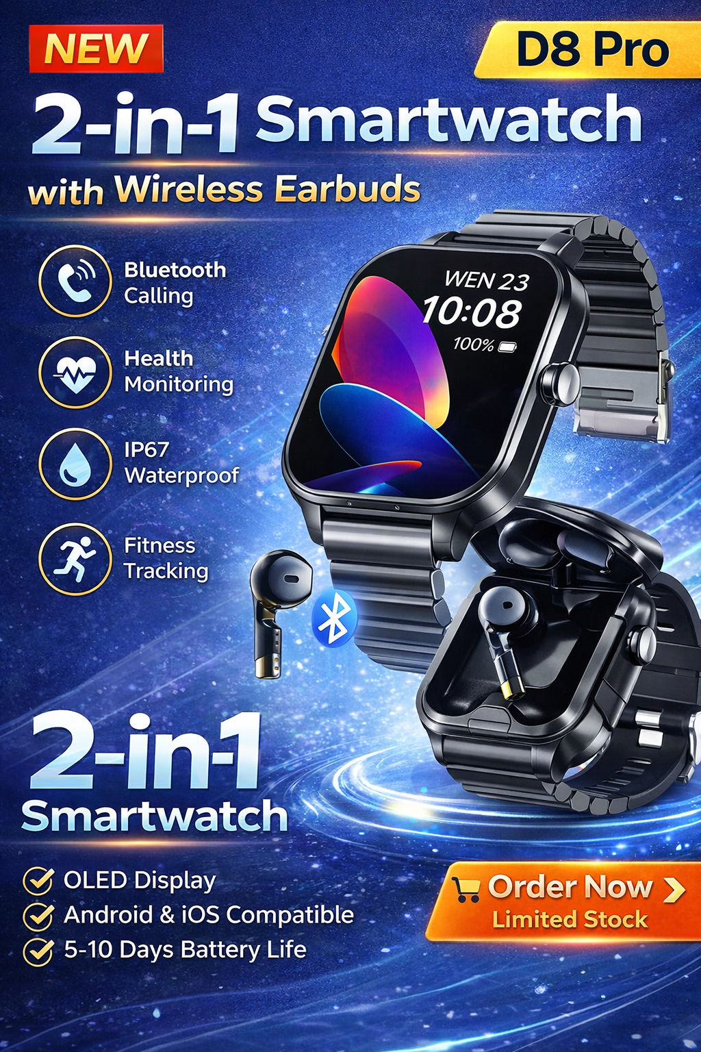 ⌚🎧 D8 Pro Smartwatch with Wireless Earbuds – Smart Life, Simplified