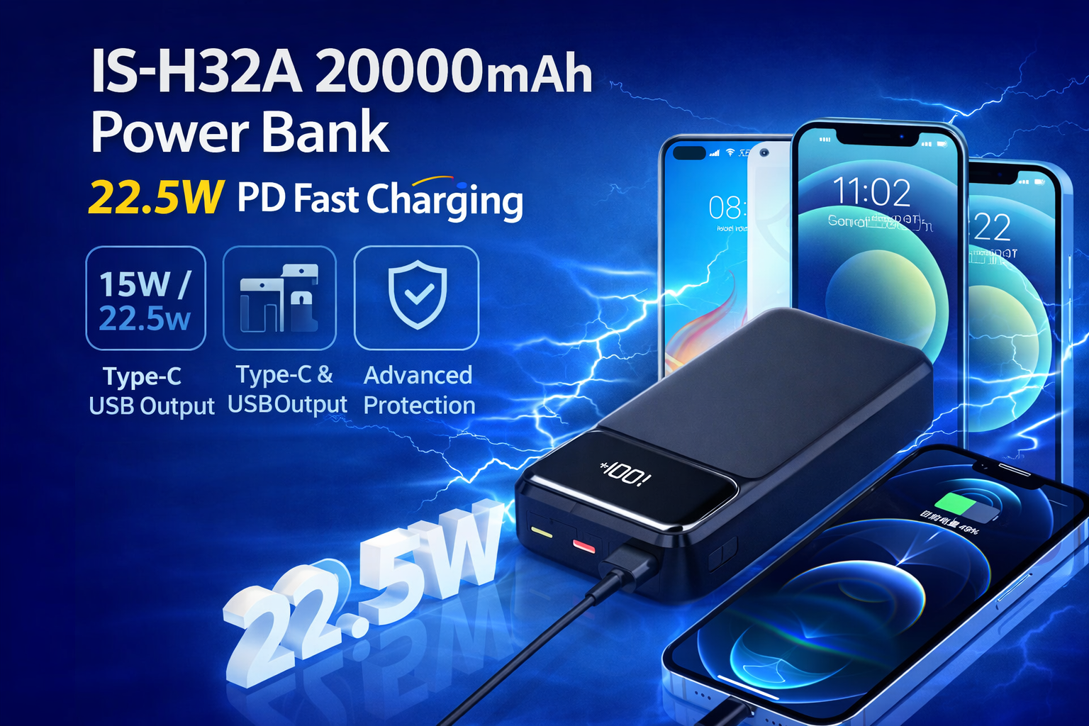 Power up your devices faster with the IS-H32A 20000mAh 22.5W PD Fast Charging Power Bank. Designed for speed and efficiency, this power bank supports high-speed charging up to 22.5W, ensuring your devices get powered quickly when you need it most.