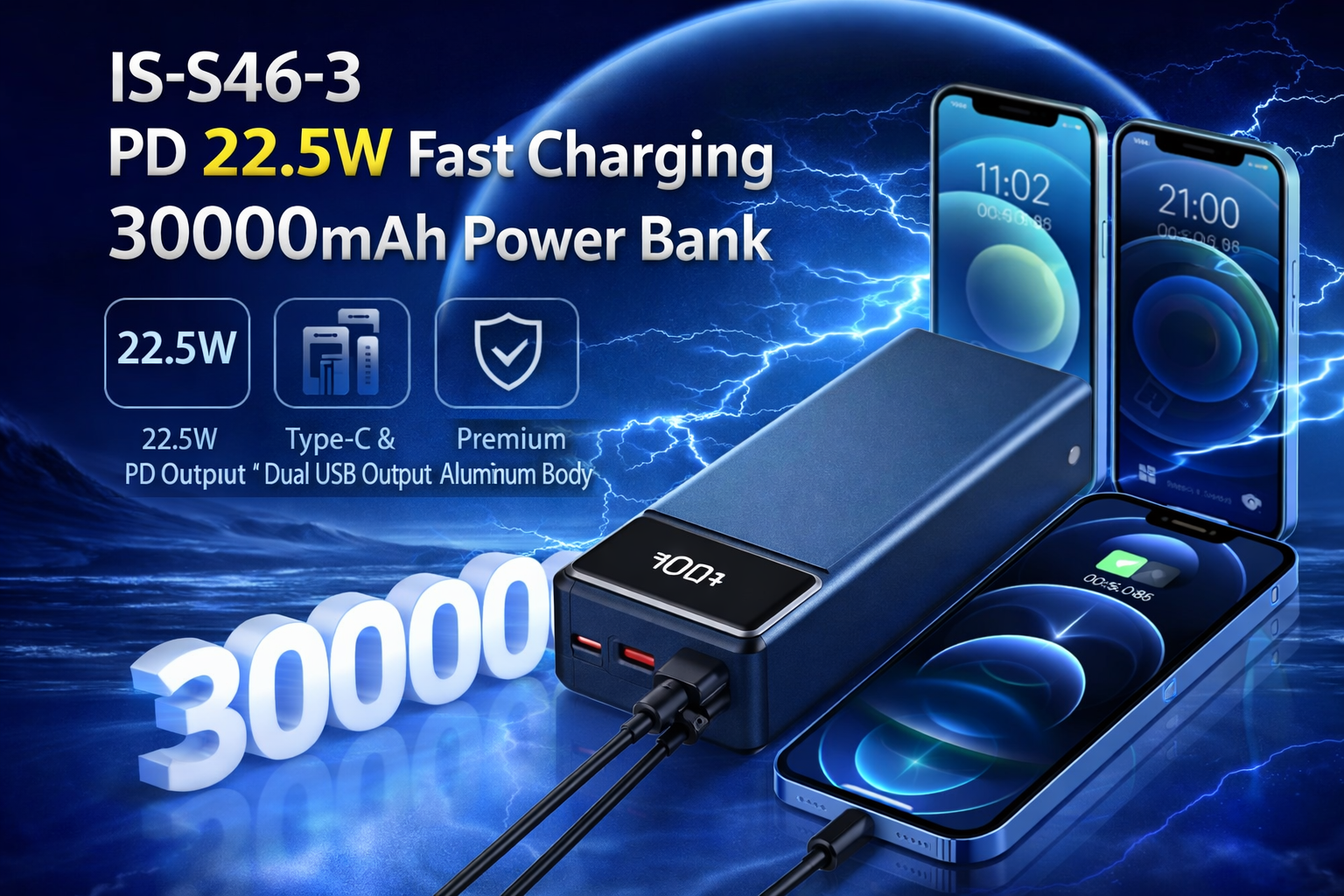 Power your devices anytime, anywhere with the IS-S46-3 30000mAh 22.5W PD Fast Charging Power Bank. Built with a premium aluminum alloy body, this power bank combines durability with high-performance fast charging.