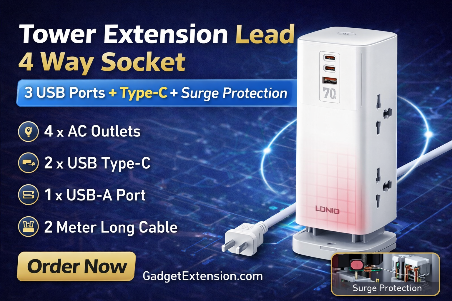 Upgrade your power solution with the LDNIO SC4383 Tower Extension Lead. Designed with 4 AC outlets and 3 USB ports (including Type-C), it allows you to charge multiple devices safely and efficiently. Perfect for home, office, and workstation use.