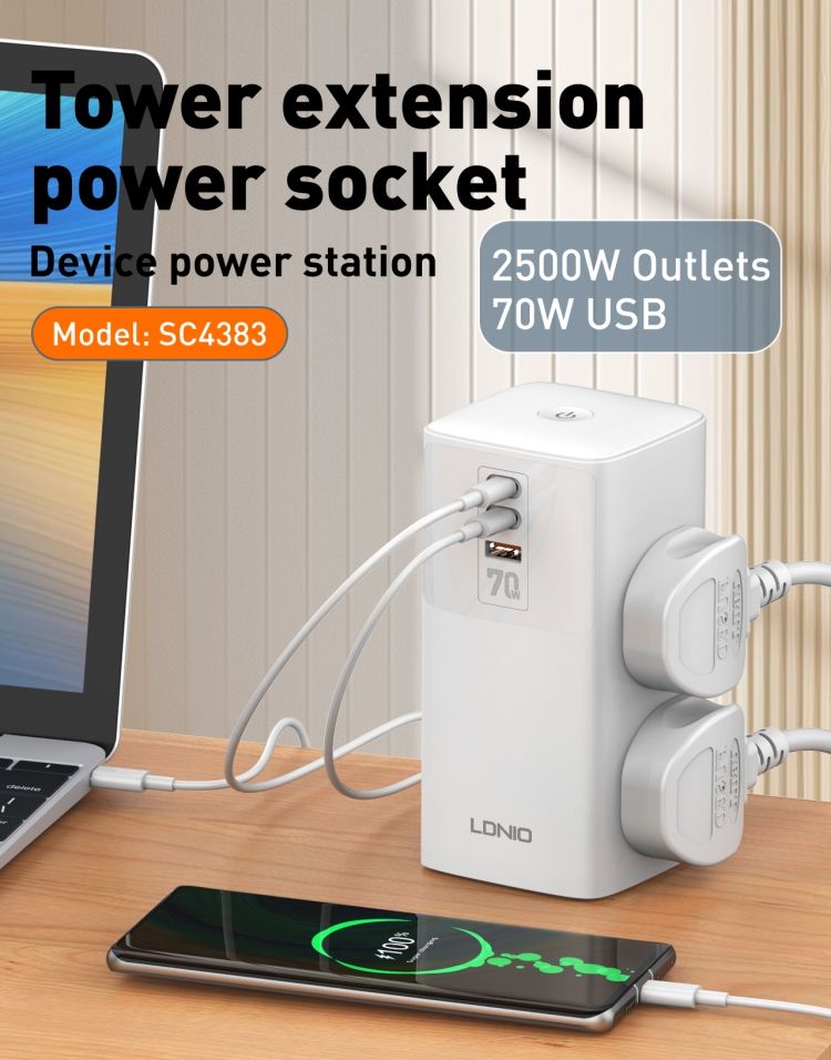 The LDNIO SC4383 Tower Extension Lead is a smart and modern power solution for your daily needs. With its vertical tower design, it saves space while offering multiple charging options for your devices.