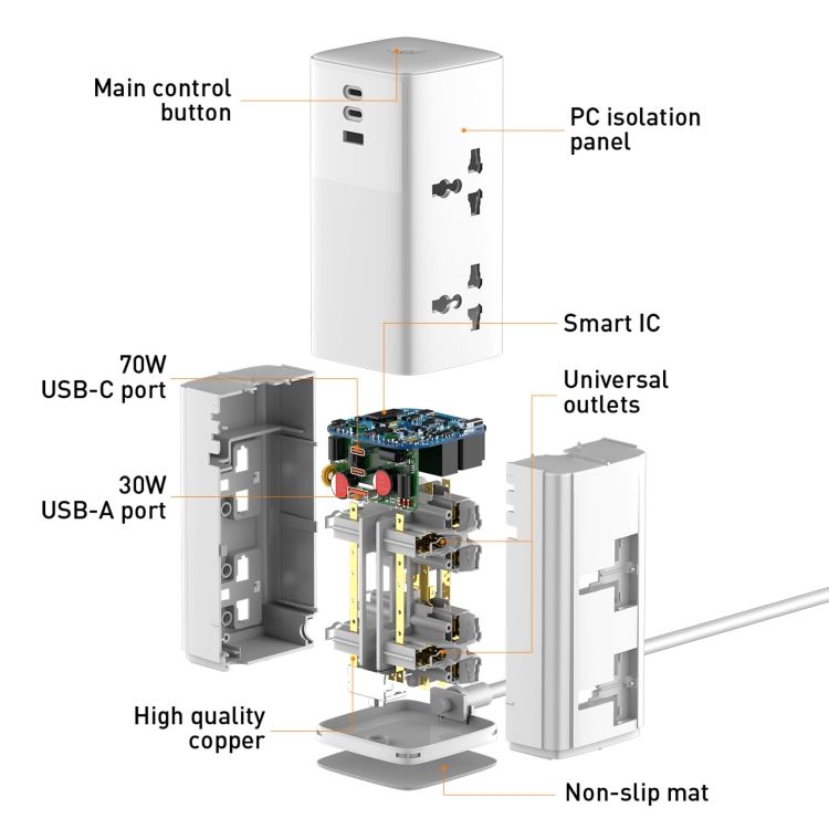 Equipped with 4 AC outlets, 1 USB-A port, and 2 Type-C ports, this extension board supports fast and efficient charging for smartphones, laptops, tablets, and other electronics.