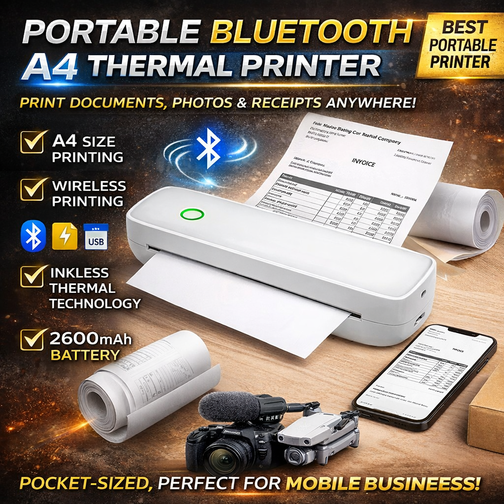 The Portable Bluetooth Thermal Printer A4 is the perfect solution for printing documents, photos, receipts, and tickets anytime, anywhere. Designed for convenience, this compact printer connects easily via Bluetooth or USB, making it compatible with smartphones, tablets, and PCs.