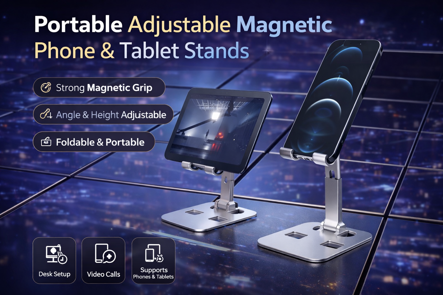 Upgrade your desk setup with this Portable Mobile Phone Holder & Tablet Stand, designed for comfort, convenience, and everyday use. With its strong magnetic hold, this stand keeps your phone or tablet securely in place while you work, study, watch videos, or attend online meetings.