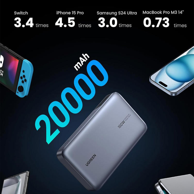 With a 20000mAh large capacity, you can charge your smartphone multiple times or even power your laptop on the go. The 100W fast charging output ensures quick energy delivery, saving you valuable time.